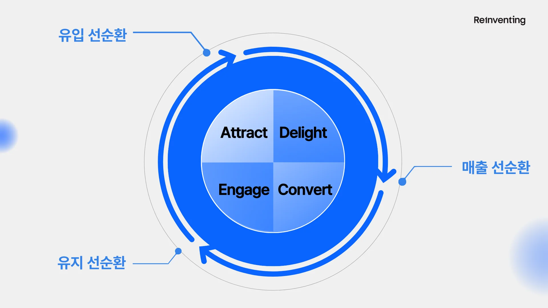 Attract–Engage–Convert–Delight가 서로 영향을 주고받으며 계속 순환됩니다.