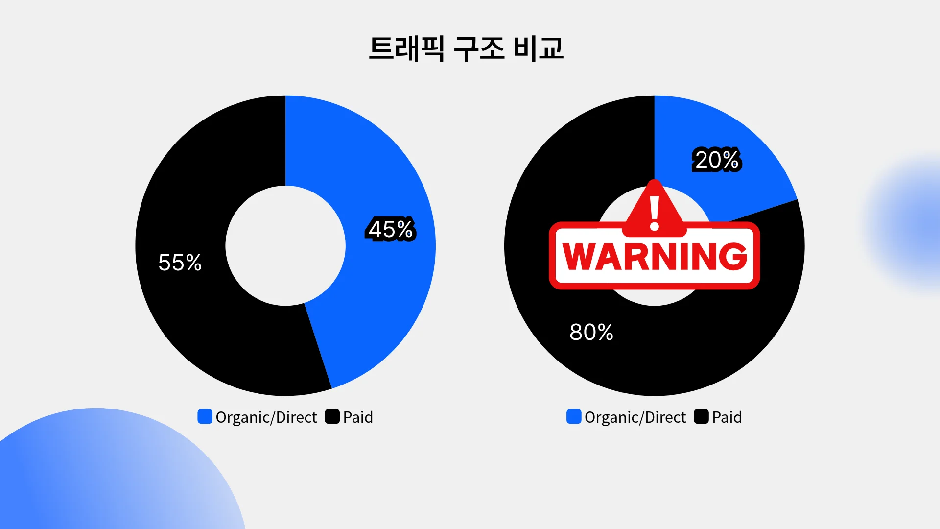 건강하게 성장하는 자사몰은 전체 트래픽의 30~50%를 Organic(자연 유입)과 Direct(직접 유입)로 채웁니다. 만약 이 비중이 지속적으로 하락하고 있다면, 유입 루프에 병목이 생긴 것입니다.